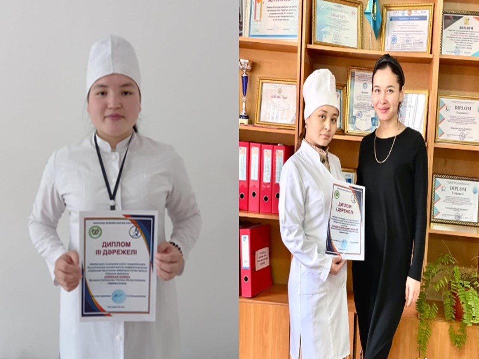 Қазақстан Республикасының жоғары медицина колледждерінің мейіргер ісінің қолданбалы бакалавр студенттері арасында «Мейіргердің ғылымдағы үлесі» тақырыбында Республикалық ғылыми-зерттеу конференциясына оқытушы Бабажанова Угилжанның жетекшілігімен колледж студенттері өздерінің ғылыми-зерттеу жұмыстарымен қатысып, Усманова Шаира І дәрежелі , Айтбай Жанерке ІІІ дәрежелі,Акимхан Зарина ІІІ дәрежелі дипломдармен марапатталды |