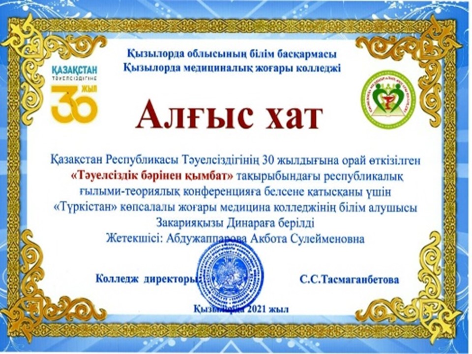Қазақстан Республикасы Тәуелсіздігінің 30 жылдығына орай «Тәуелсіздік бәрінен қымбат » тақырыбында өткізілген республикалық ғылыми — теориялық конференцияға колледж оқытушысы Абдужаппарова Ақботаның жетекшілігімен қолданбалы бакалавр студенті Закарияқызы Динара қатысып, Алғыс хатпен марапатталды |