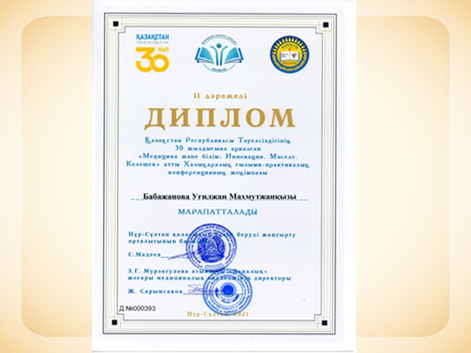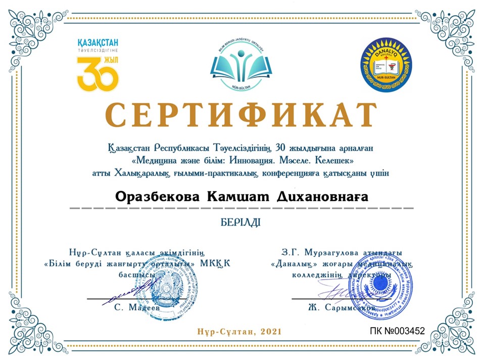 Қазақстан Республикасы Тәуелсіздігінің 30 жылдығына арналған «Медицина және Білім : Инновация.Мәселе.Келешек» атты халықаралық ғылыми-практикалық конференцияға оқытушыларымыз Бабажанова У, Оразбекова К, Дүйсенбаева М қатысып, жүлделі ІІ — орынды иемденді |