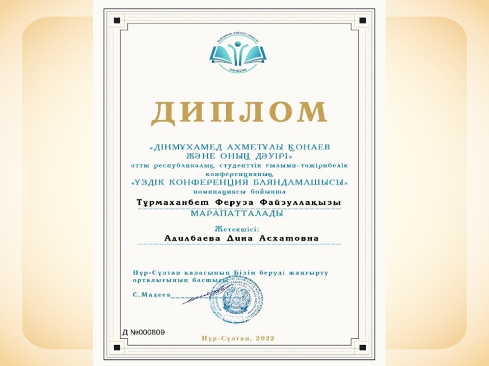 «ДІНМҰХАМЕД АХМЕТҰЛЫ ҚОНАЕВ және оның дәуірі » атты Республикалық студенттік ғылыми-тәжірибелік конференцияда баяндама оқып, студент Тұрмаханбет Феруза,жетекшісі Адилбаева Дина «Үздік конференция баяндамашысы» номинациясымен марапатталды |