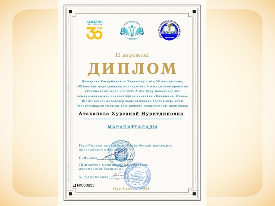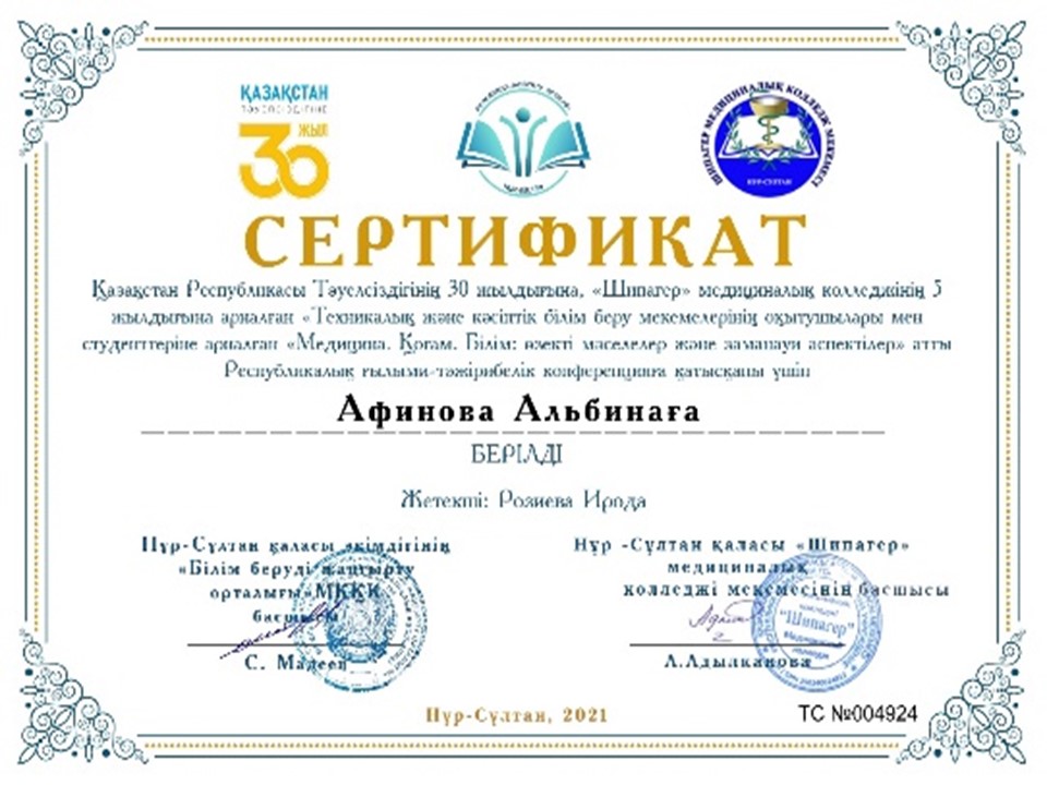 Қазақстан Республикасы Тәуелсіздігінің 30 жылдығына «Медицина. Қоғам.Білім : өзекті мәселелер мен заманауи аспектілер» атты Республикалық ғылыми- тәжірибелік конференцияға колледж оқытушысы Атаханова Хурсанай қатысып, ІІ- орынды иемденді |